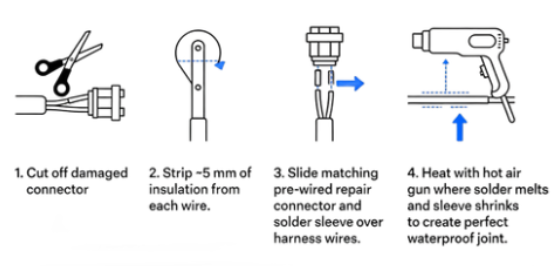 The fastest repair method on the market. Cut the old connector, solder or crimp the pre-wired leads to the existing wiring, shrink – done. No terminal insertion, no seal hunting.
